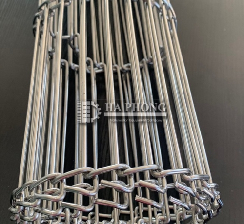 Băng tải lưới thang được làm bằng dây thép không gỉ (SUS304) uốn dạng ô nối trục tiếp lại với nhau.