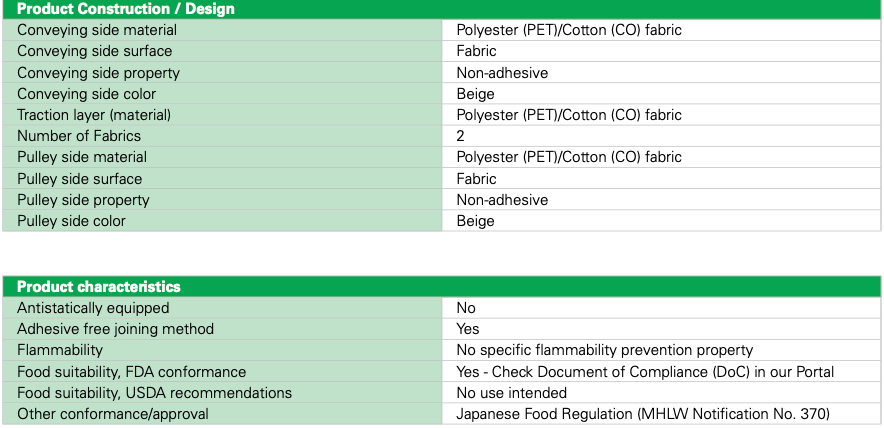 Băng tải PET/CO Habasit 212TCW có kết cấu vải vóc, mặt băng tải và lớp kéo đều được làm từ vải Polyester (PET) / Cotton (CO), bề mặt băng tải không bám dính.