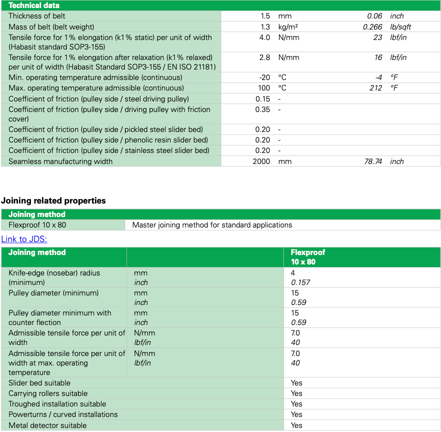 Băng tải PET/CO Habasit 212TCW tuân thủ FDA, có tài liệu kiểm tra tuân thủ (DoC)
